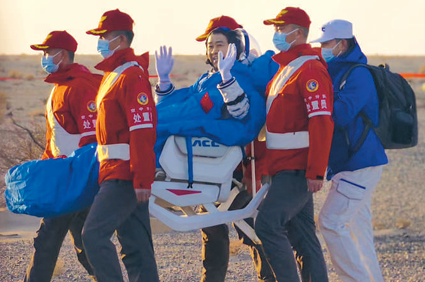 14日上午6时,对航天员进行了初步的身体检查。率先冲向返回舱的是国旗手陈龙。着陆场上的返回舱回收工作依然繁忙有序。