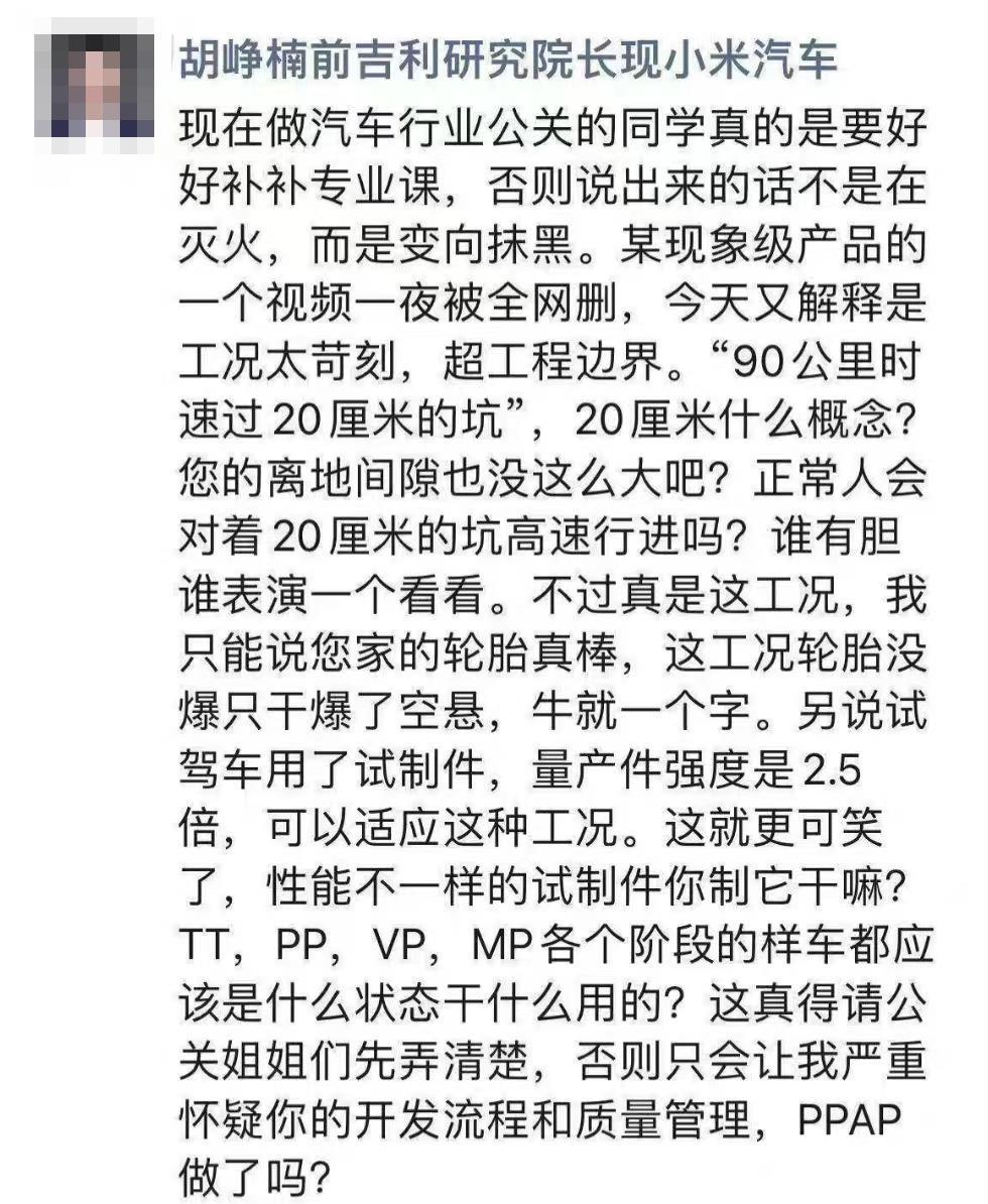 据媒体报道,吉利研究院原院长胡峥楠也在社交媒体上公开质疑:“‘以90公里时速通过20厘米的空气坑’不太符合实际情况。如果坑深达到50厘米,悬挂在高速行驶时降低车辆高度以提高行驶稳定性。争议从而导致他们无法对产品做出冷静、理想