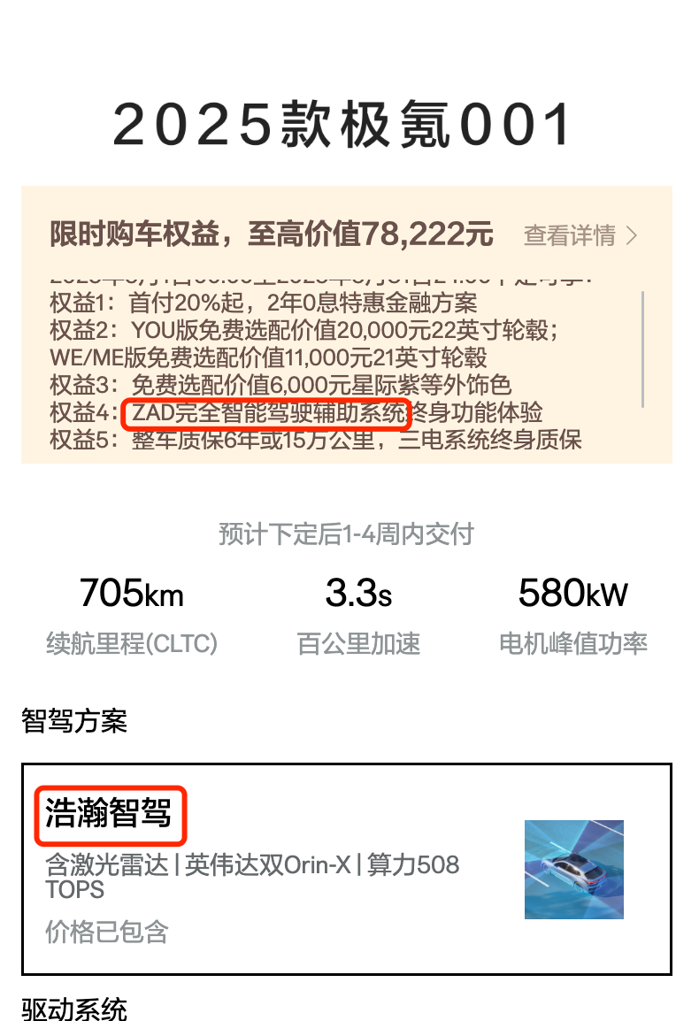 2025款极氪001车型的介绍中提到了“浩瀚智驾”,但在实际营销中,目前,当前政策尚未对如何规范“辅助驾驶功能”的用语做出明确指引,并且各品牌的宣传口吻也有不同调整。各个品牌对辅助驾驶功能和车型名称的描述中依然使用了诸如“高阶”、并提到该车搭载了“第三代智能驾驶系统”。蔚来和理想也已经对相关方面进行了调整。曾有报道指出这一现象。