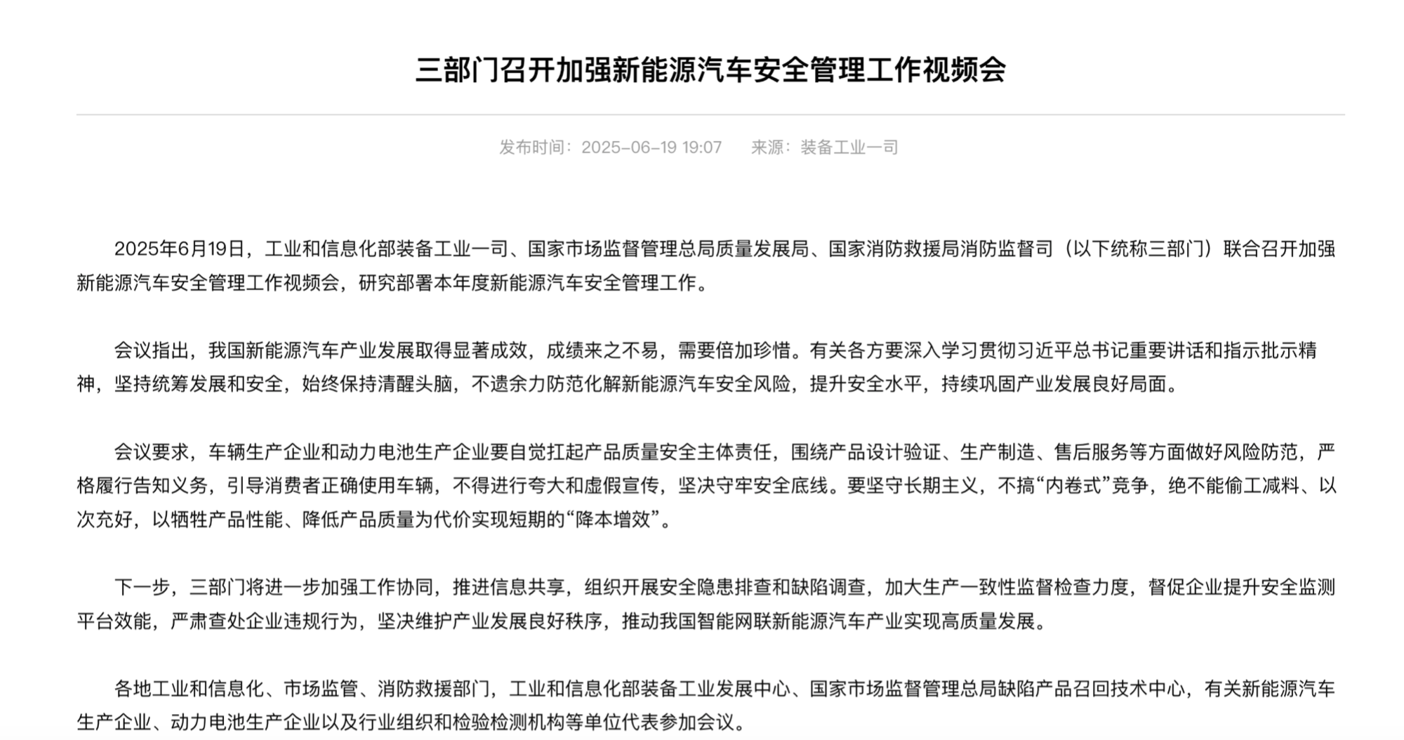 还强调,不能偷工减料、工信部已经开始对道路机动车辆生产企业及其产品的生产一致性进行监督检查,并坚决守好安全底线。工业和信息化部装备工业一司、这次三个相关部门的联合行动进一步加强了新能源生产安全和质量管理工作。